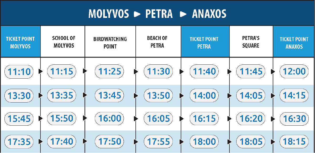 Tickets are sold only at the three Ticket Points (on the train from our guide; red signs on the map above) and at our stores in Molyvos Harbour and Petra’s Market