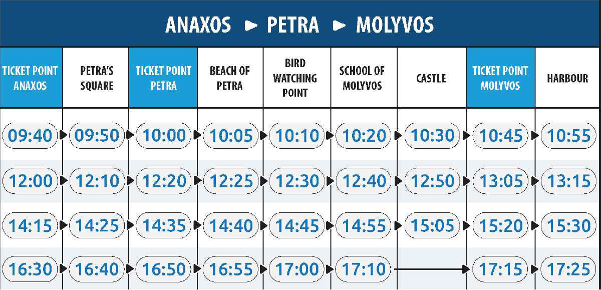 Our trains operate daily between Anaxos, Petra, and Molyvos, offering a convenient and scenic way to explore the area.